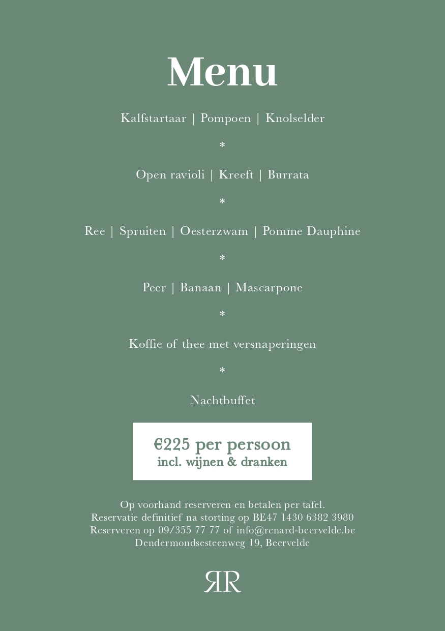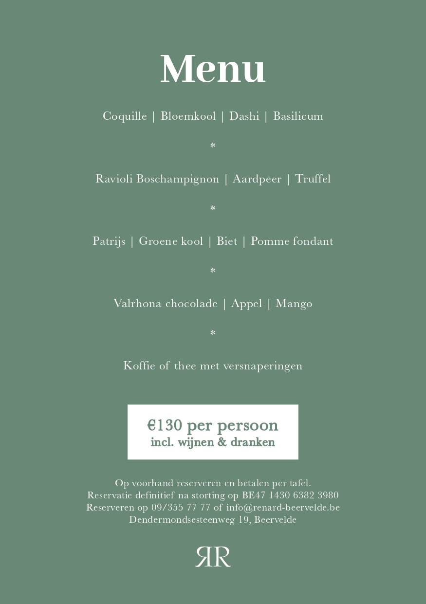 Reserveer 09 355 77 77 of info@restaurant-renard.be